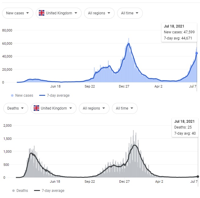 The financial news media is abuzz with suggestions that a rise in Covid-19 cases, this time by the delta variant, is to blame. Multiple countries are seeing an uptick in Covid-19 cases, with the UK especially apparent — cases in the UK are at 70% of all time highs (around 48k cases/day, compared to around 68k/day at the highs), and appears on track to take out the highs in a week or two. UK health officials and media are flirting with the idea of lockdown again, though Boris Johnson did not relent, with Freedom Day finally arriving yesterday.